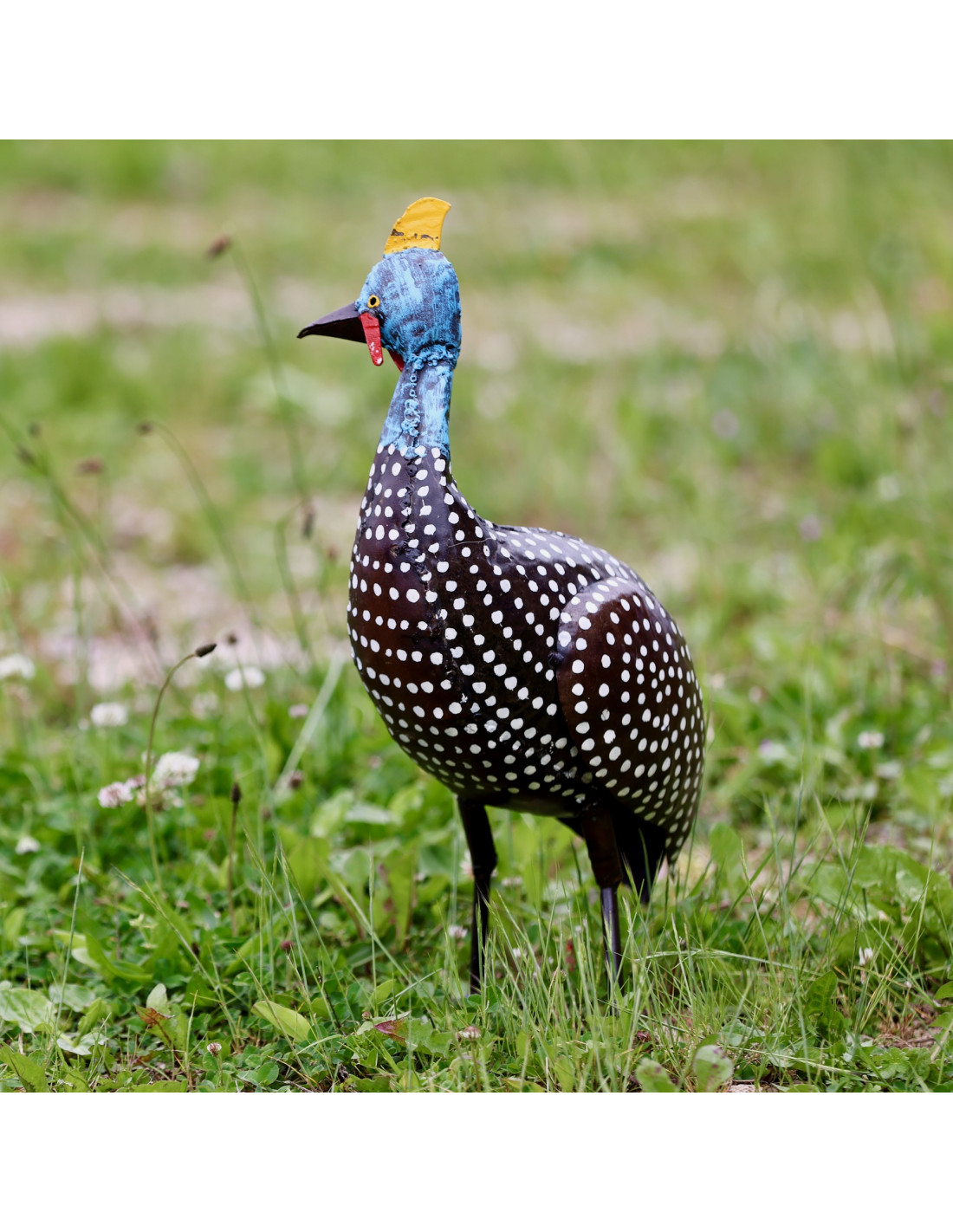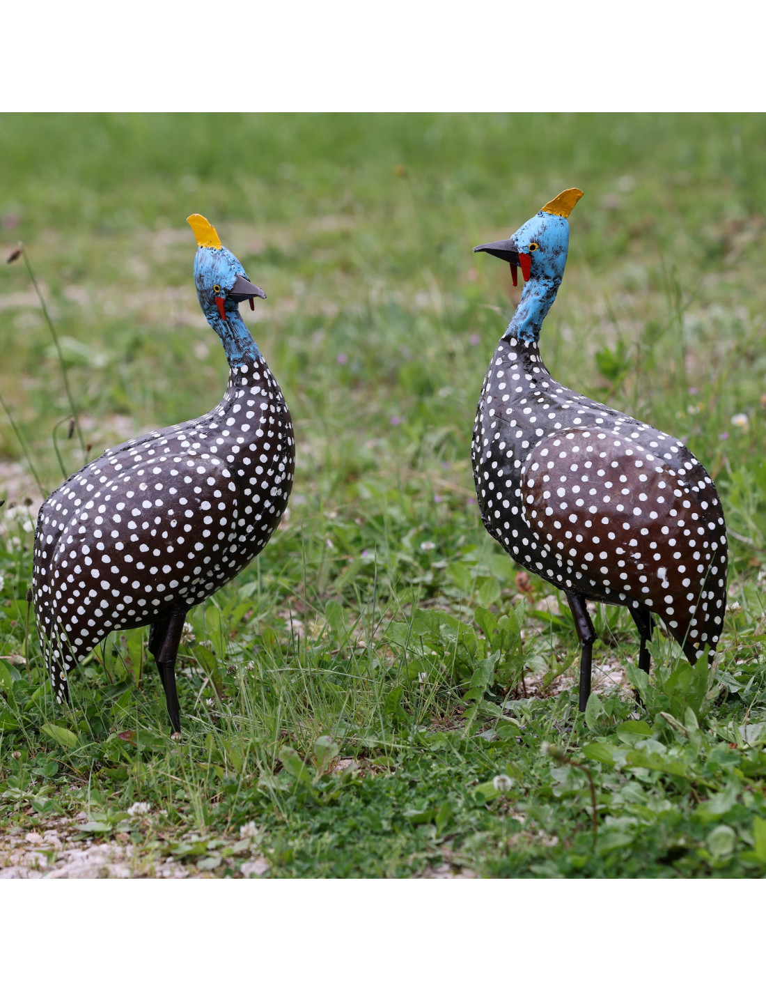 Fabriquée à partir de métal recyclé, chaque pièce est façonnée, soudée puis peinte à la main. Chaque pintade est donc unique : attitudes et expressions peuvent varier, donnant à chaque création son propre caractère.