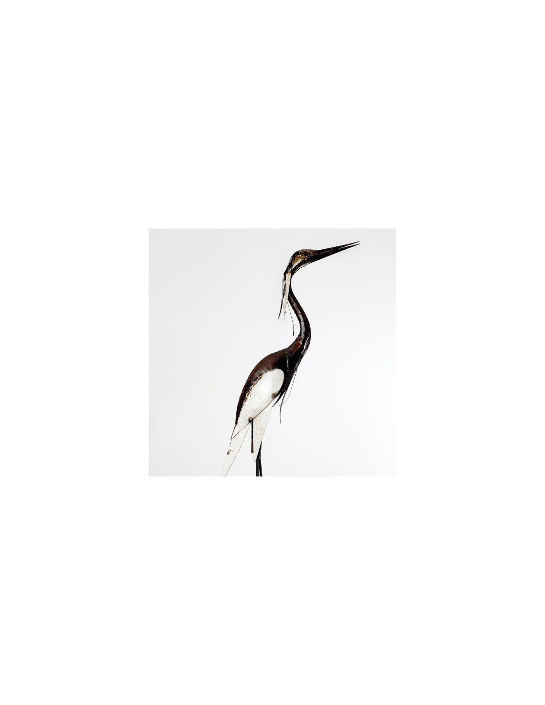 Le héron en métal est créé à partir de métal brut patiné, ce qui lui offre une jolie teinte brune aux nuances de gris.