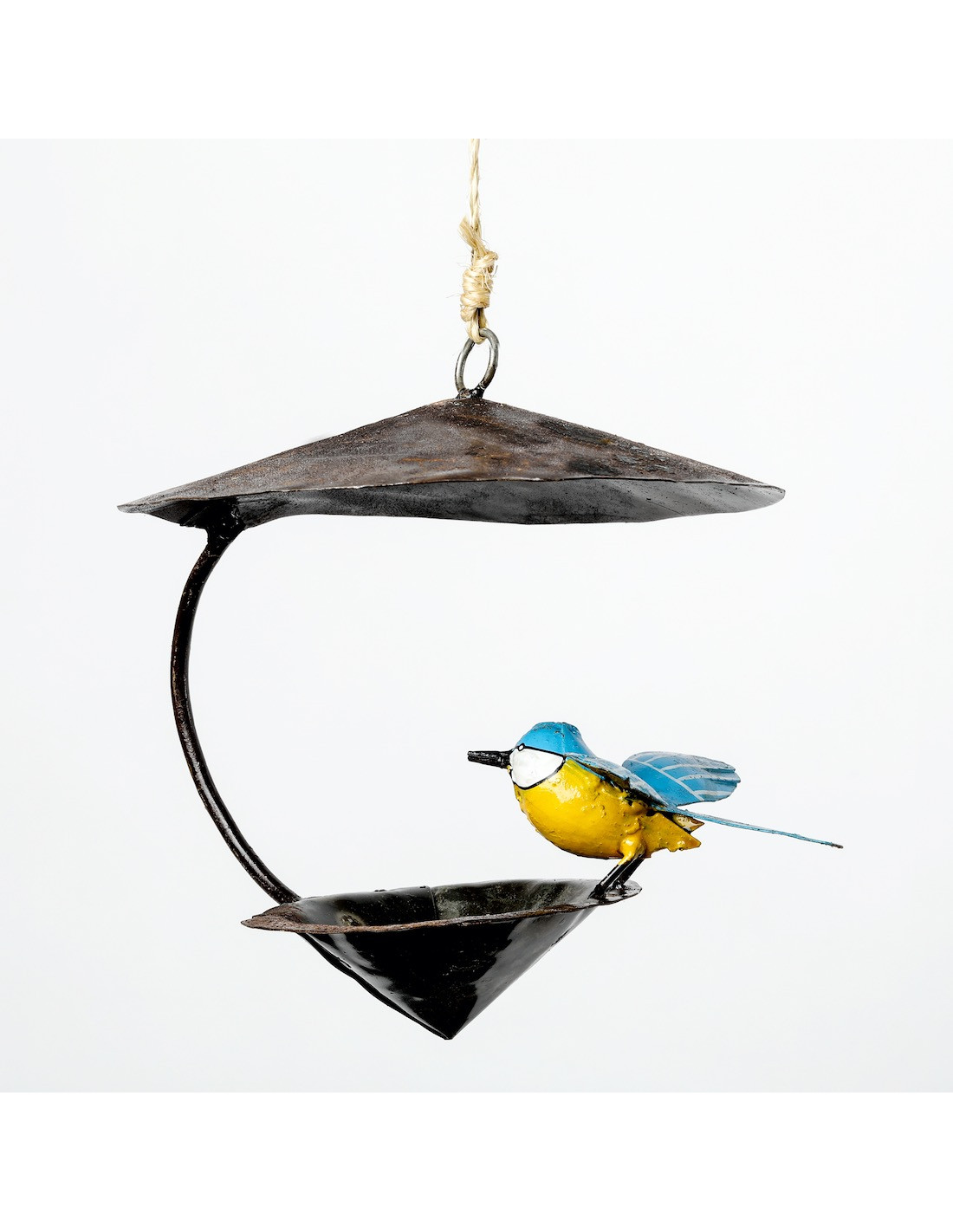 Entièrement en métal soudé, cette jolie pièce est composée d'une coupelle conique et d'un toit sur laquelle une mésange aux ailles ouvertes est venue se poser.