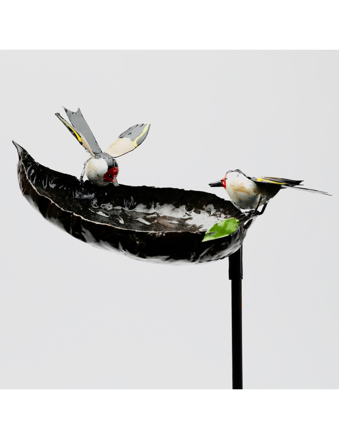 Entièrement en métal soudé, cette jolie pièce est composée d'une tige solide et d'une grande coupelle en forme de feuille, sur laquelle deux chardonnerets sont venus se poser.
