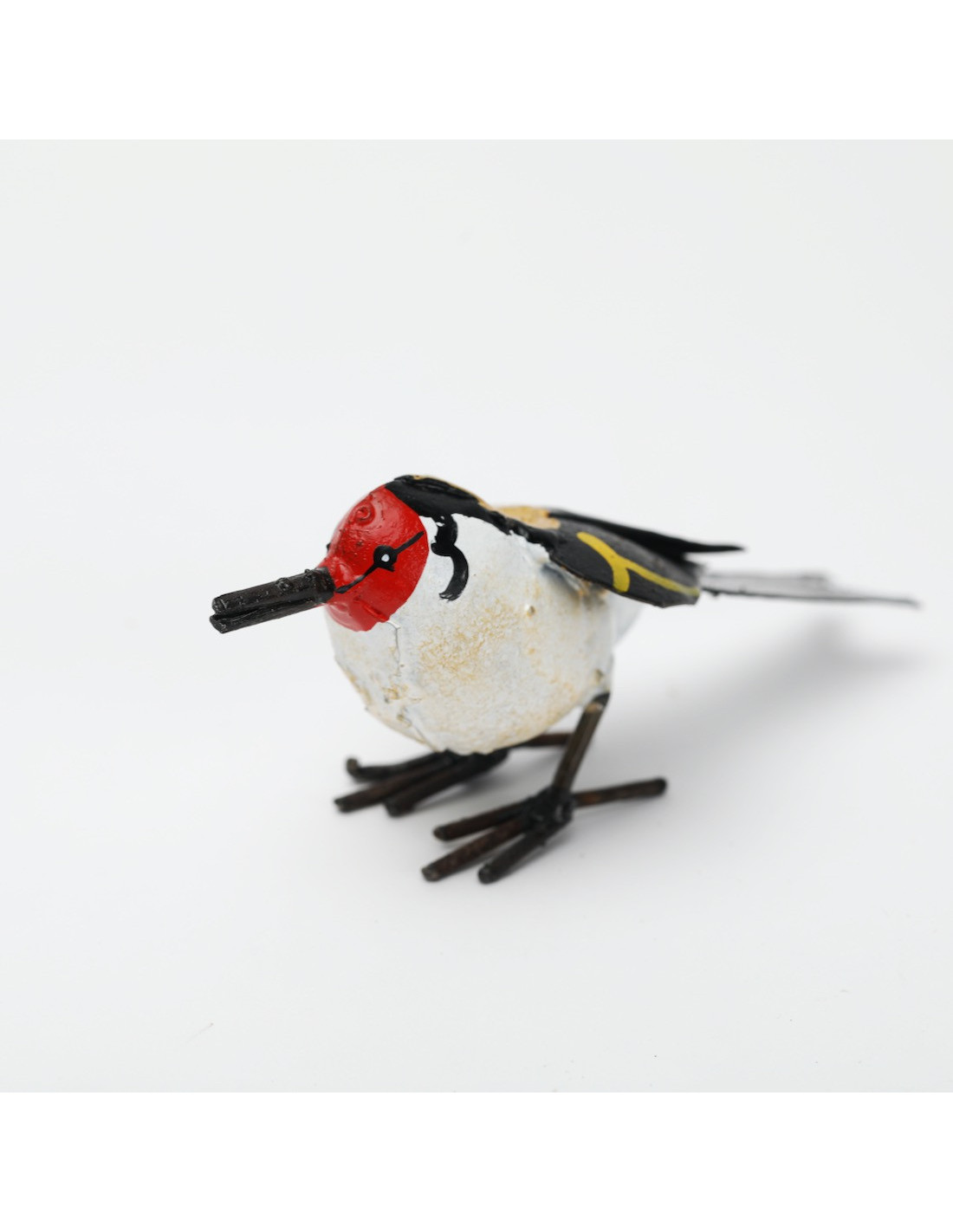 Notre chardonneret est créée à partir de métal recyclé, entièrement soudé et peint à la main. (Peinture spéciale métal)